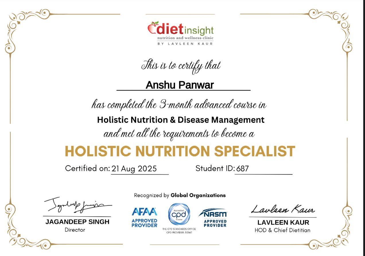 Anshu Panwar is a holistic nutritionist dedicated to improving lives through personalized, evidence-based health guidance and compassionate care.